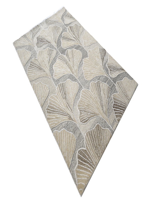 Featuring a vertical arrangement of stylized ginkgo leaves, this rug blends botanical grace with modern simplicity. Each leaf is delicately rendered in shades of beige, taupe, and gray, radiating from a textured gray background that adds depth and contrast. The result is a soothing visual rhythm that complements minimalist, Japandi, and nature-themed interiors.