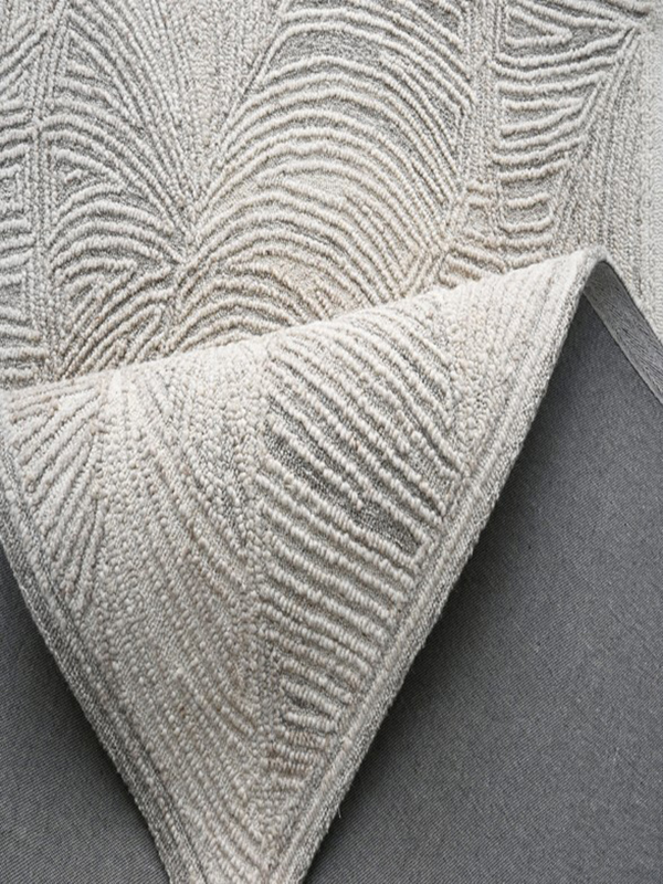 Transform your space with this monochrome abstract rug, featuring a rhythmic interplay of curved and straight lines that form elegant leaf-like motifs. The symmetrical pattern and layered textures in shades of gray and white create a calming, modern aesthetic—perfect for minimalist, contemporary, or Scandinavian interiors.