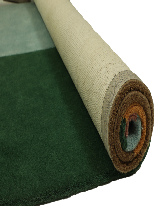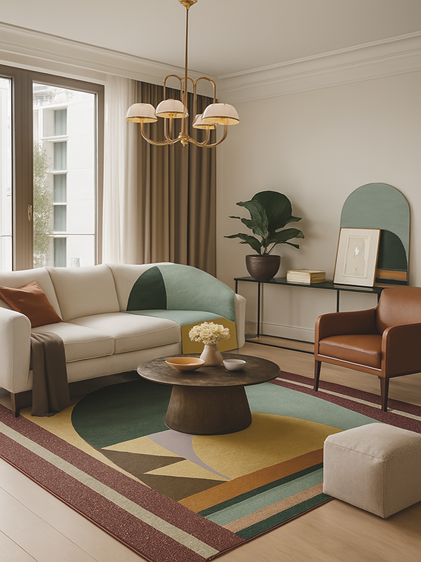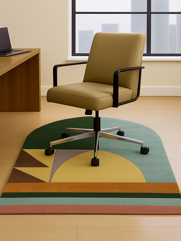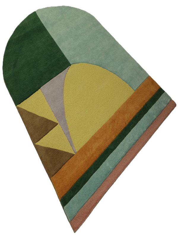 Crafted from high-quality 100% New Zealand Wool with Unique Shape and Waterproof Backing. For softness, durability, and natural stain resistance. Bold, modern abstract design with geometric shapes and arch silhouette for a contemporary artistic statement. Rich tones of deep green, mustard yellow, teal blue, terracotta, muted pink, brown, and lavender. Unique rounded arch shape adds architectural elegance and a designer edge to any space. Perfect for modern living rooms, creative studios, bedrooms, and statement entryways.