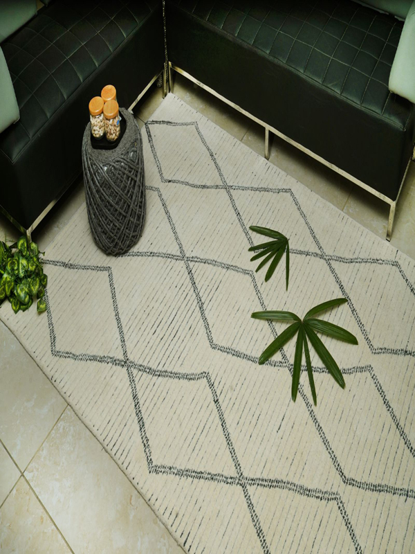 This rug showcases a repeating diamond motif inspired by traditional weaving patterns. The understated contrast and organic texture create a calm, balanced look that complements both contemporary and bohemian interiors. Its versatile design allows it to layer beautifully with other décor while standing out as a statement piece on its own.