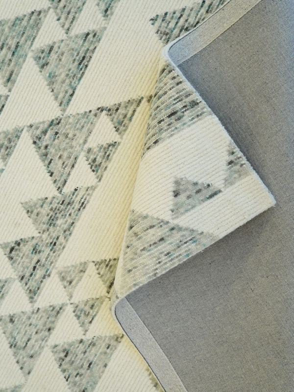 This rug showcases a repeating triangle pattern inspired by natural landscapes and modern geometry. The subtle contrast of ivory, soft grey, and muted blue-grey hues creates a serene visual flow without overpowering your décor.