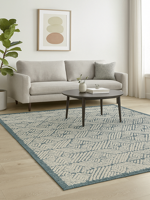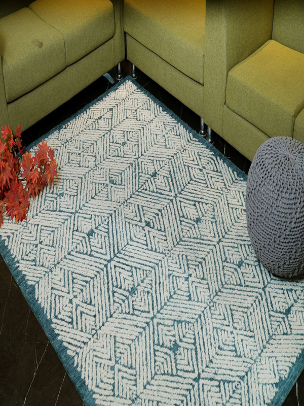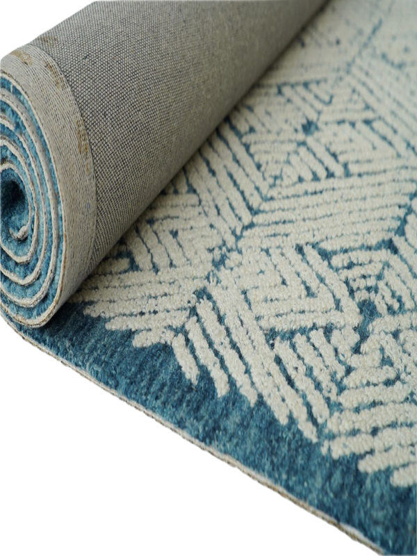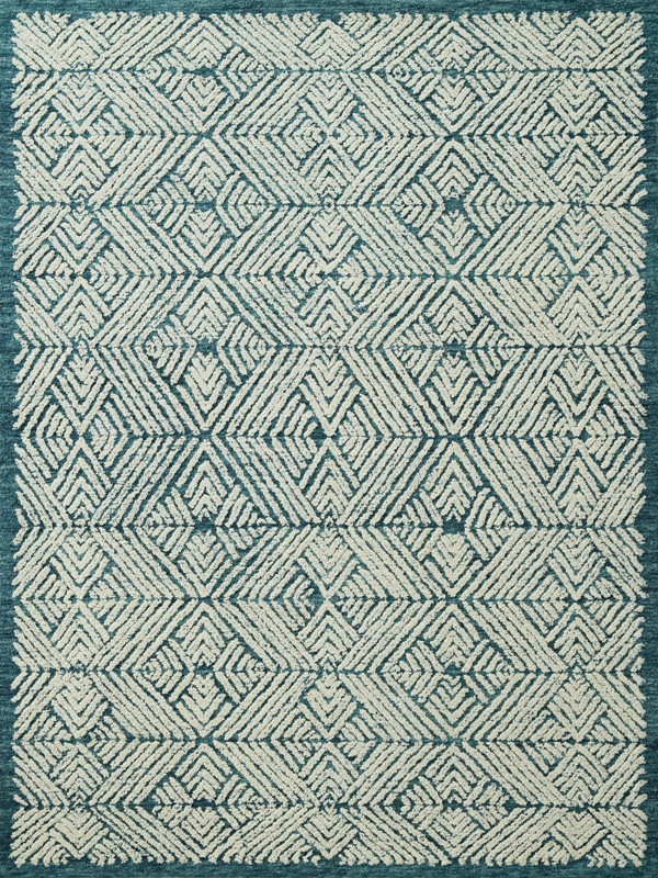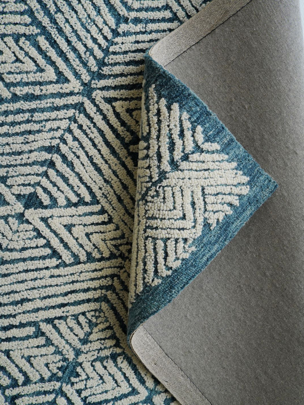 This rug showcases a repeating diamond pattern formed by intricate linear detailing, giving it depth and visual movement. The contrast between soft ivory highlights and deep teal tones adds dimension while maintaining a calm, sophisticated aesthetic.