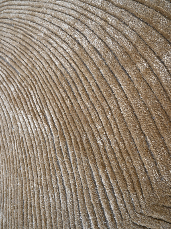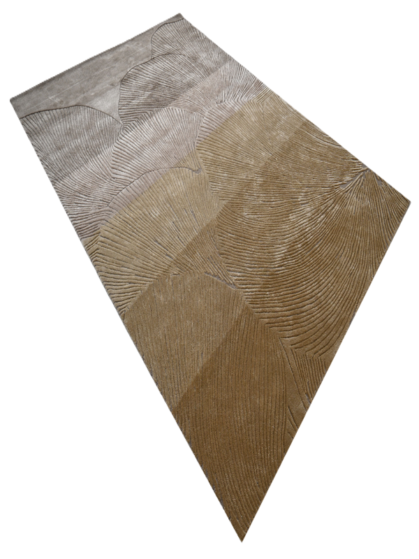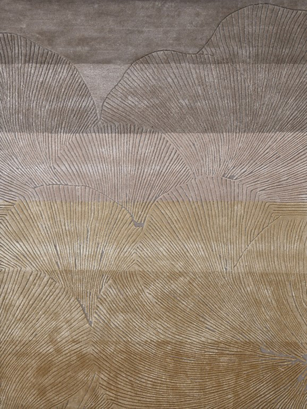 Inspired by natural forms and organic movement, the rug showcases overlapping, scalloped motifs with finely etched linear detailing. The harmonious palette of taupe, sand, beige, and soft gold creates a serene, contemporary look that pairs beautifully with both modern and classic interiors.