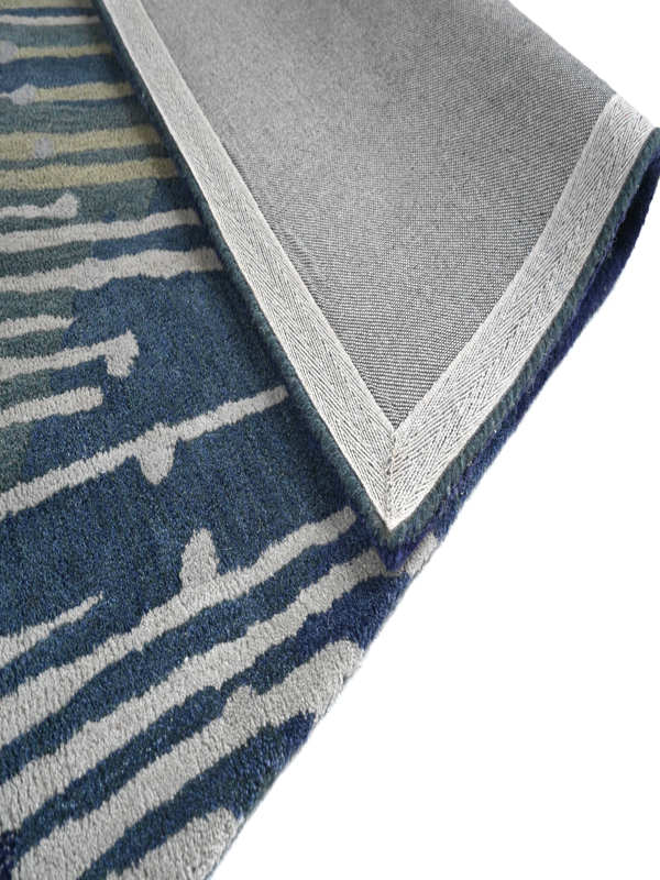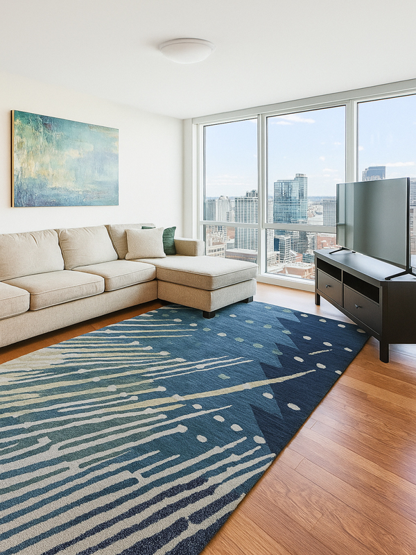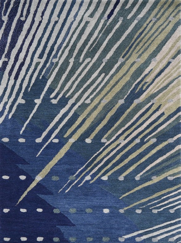 Bring a touch of modern artistry into your space with this striking area rug. Featuring a bold pattern of cascading lines and dotted accents, the design captures the dynamic energy of movement and flow. Shades of deep navy, ocean blue, teal, and soft ivory blend seamlessly to create a contemporary yet timeless palette that suits a variety of interiors. Crafted from premium, durable fibers, this rug offers both style and comfort underfoot. The textured weave enhances the visual depth of the design while ensuring long-lasting resilience, making it perfect for high-traffic areas like living rooms, bedrooms, or home offices.