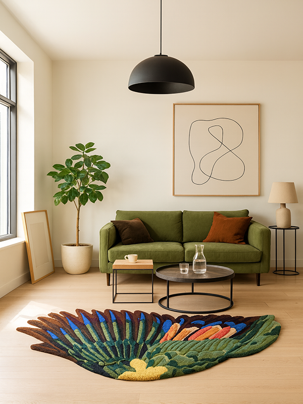 Elevate your interior with a sculptural textile masterpiece—an exclusive hand-tufted artwork meticulously crafted to embody the richness of the natural world. This organic, freeform piece merges fine craftsmanship with contemporary design, revealing a symphony of deep greens, earthen hues, and vibrant botanical accents.