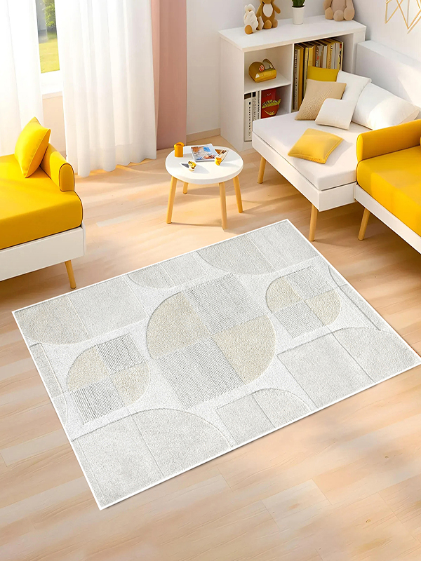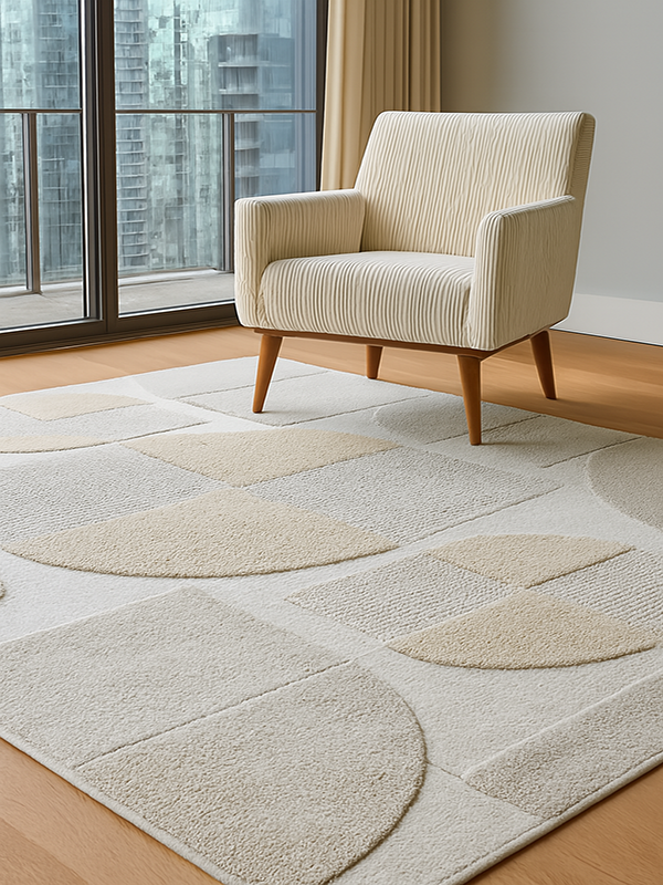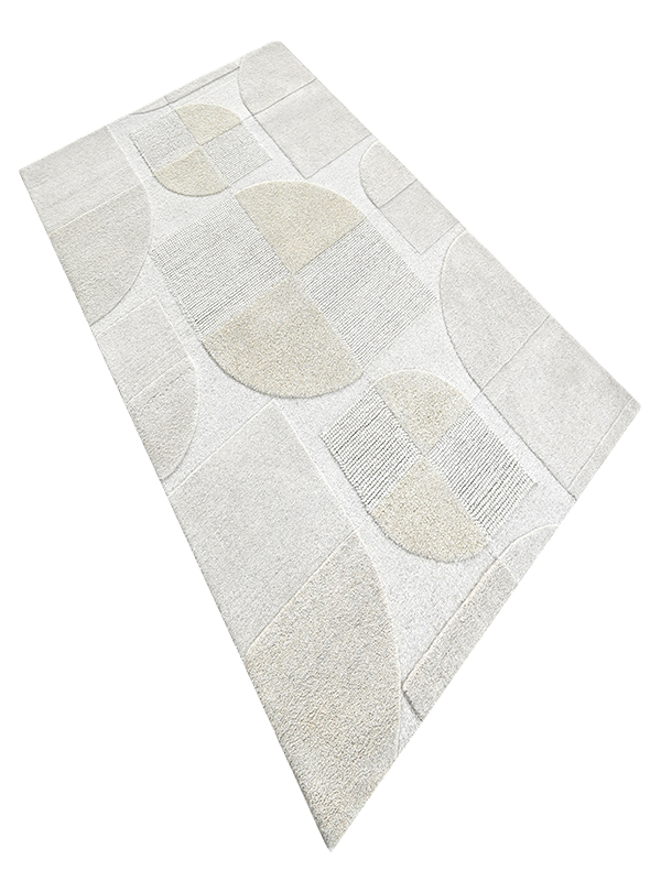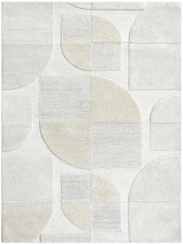 Step into structured serenity with our GeoNest Textured Rug, where modern geometry meets tactile sophistication. This design features a harmonious grid of semi-circles, rectangles, and squares in a soothing palette of white, beige, and light gray. Each shape is defined by varied pile heights and weaves, creating a subtle play of shadow and texture. Perfect for grounding contemporary interiors, this rug offers both visual rhythm and cozy comfort.
