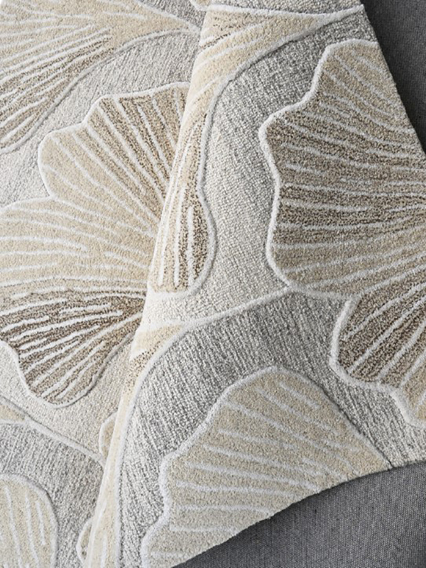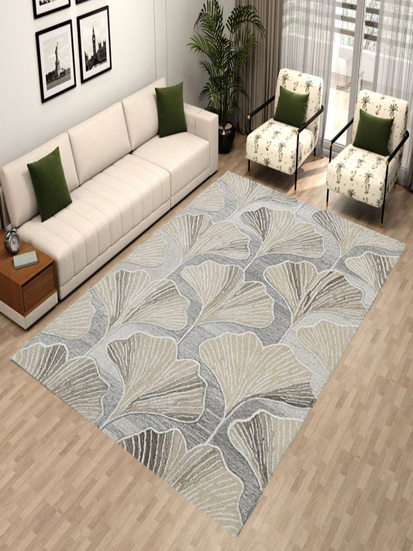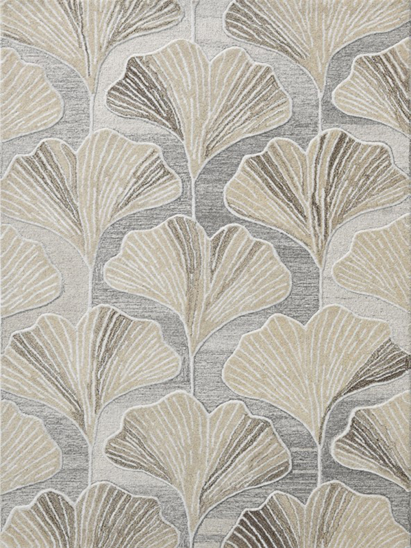 Featuring a vertical arrangement of stylized ginkgo leaves, this rug blends botanical grace with modern simplicity. Each leaf is delicately rendered in shades of beige, taupe, and gray, radiating from a textured gray background that adds depth and contrast. The result is a soothing visual rhythm that complements minimalist, Japandi, and nature-themed interiors.