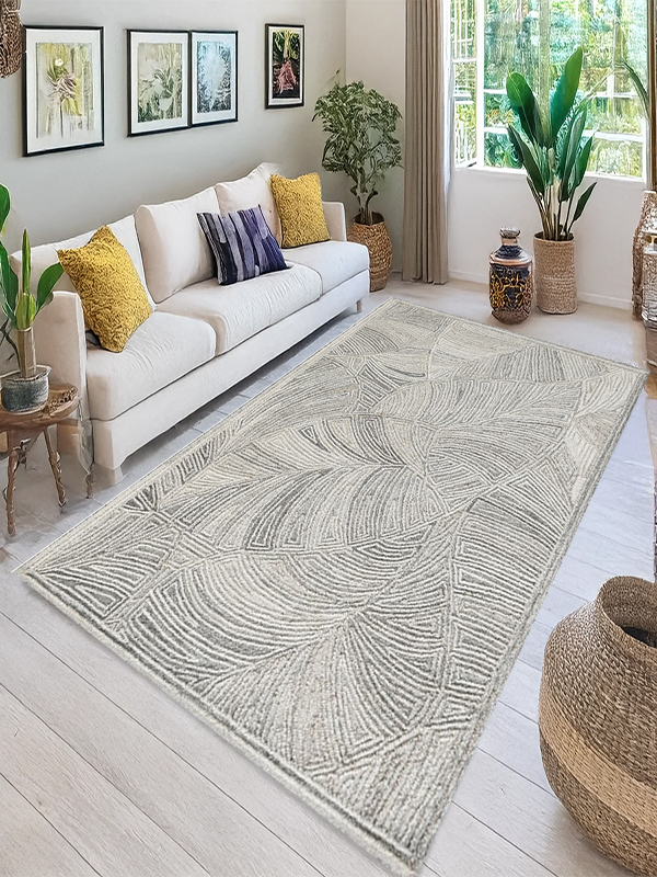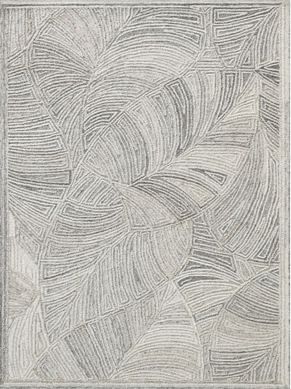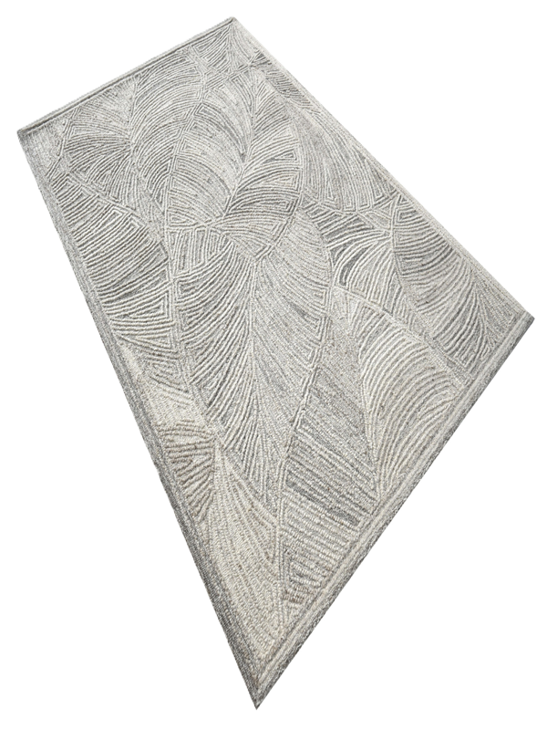 Transform your space with this monochrome abstract rug, featuring a rhythmic interplay of curved and straight lines that form elegant leaf-like motifs. The symmetrical pattern and layered textures in shades of gray and white create a calming, modern aesthetic—perfect for minimalist, contemporary, or Scandinavian interiors.