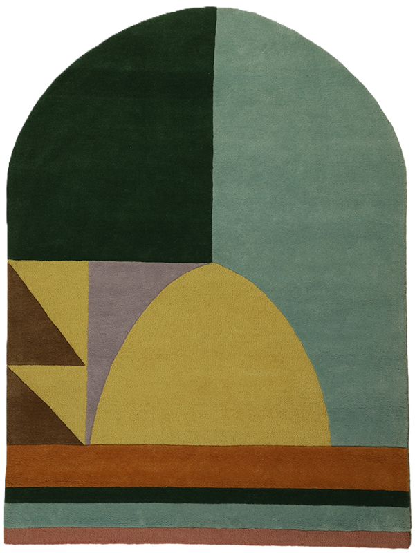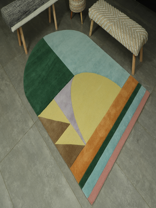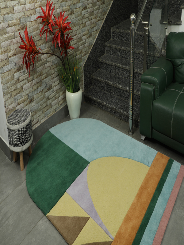 Crafted from high-quality 100% New Zealand Wool with Unique Shape and Waterproof Backing. For softness, durability, and natural stain resistance. Bold, modern abstract design with geometric shapes and arch silhouette for a contemporary artistic statement. Rich tones of deep green, mustard yellow, teal blue, terracotta, muted pink, brown, and lavender. Unique rounded arch shape adds architectural elegance and a designer edge to any space. Perfect for modern living rooms, creative studios, bedrooms, and statement entryways.