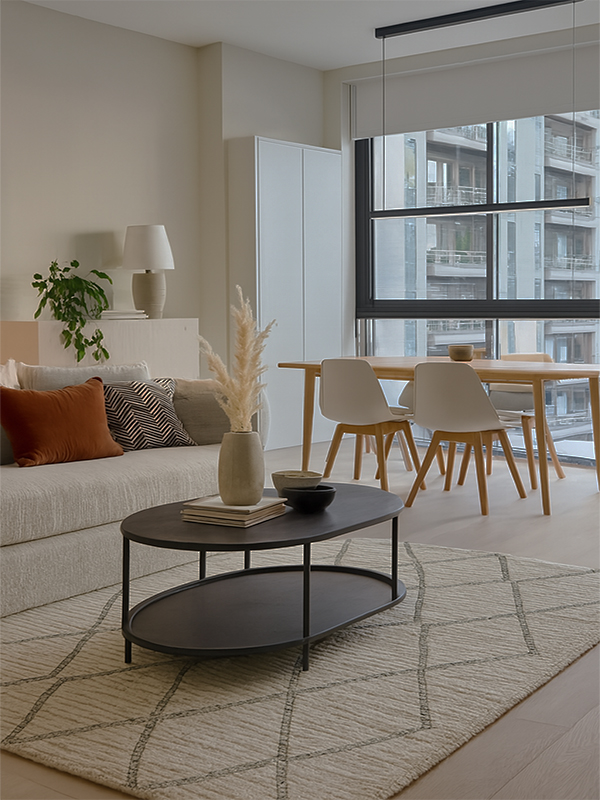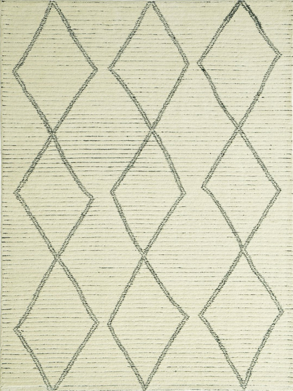 This rug showcases a repeating diamond motif inspired by traditional weaving patterns. The understated contrast and organic texture create a calm, balanced look that complements both contemporary and bohemian interiors. Its versatile design allows it to layer beautifully with other décor while standing out as a statement piece on its own.