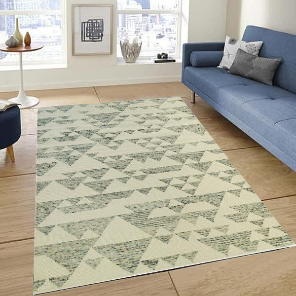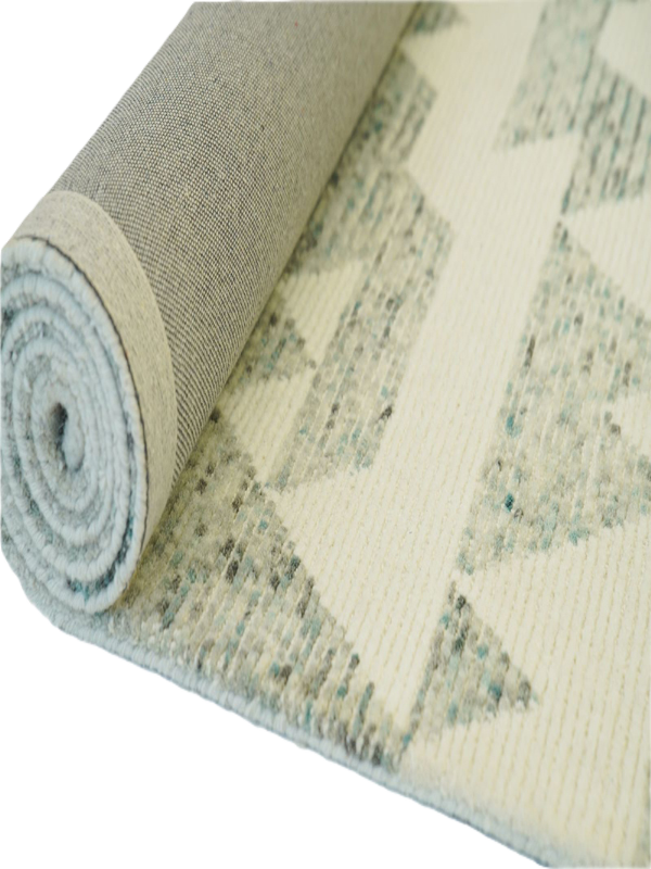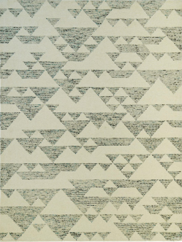 This rug showcases a repeating triangle pattern inspired by natural landscapes and modern geometry. The subtle contrast of ivory, soft grey, and muted blue-grey hues creates a serene visual flow without overpowering your décor.